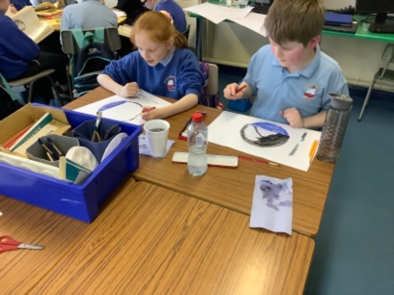 P5/6 are currently exploring the topic ‘Titanic’. As part of their work on this, they recently created some art work depicting what a passenger on the Titanic might have seen through their portholes in their cabin on the night the ‘Titanic’ hit the iceberg. They used water paints to explore creating different colours for the sea and night sky. Fantastic work everyone!