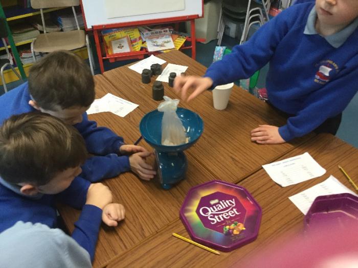 As part of today’s lesson the children used practical resources to learn about weight. They used two different type of scales: the pan scales & mechanical scales (kitchen scales) to measure the weight of sand & flour.